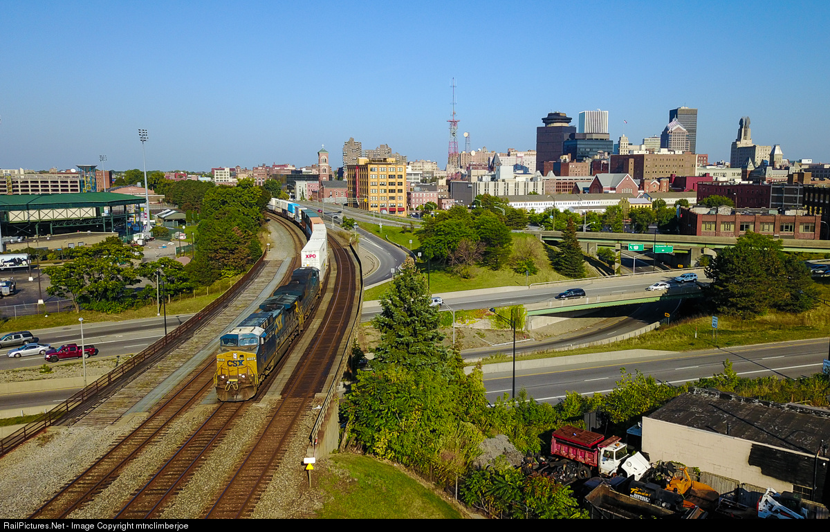 CSX westbound intermodal train Q161 heads west through the city of Rochester and crosses over the I-490 and Inner Loop interchange.