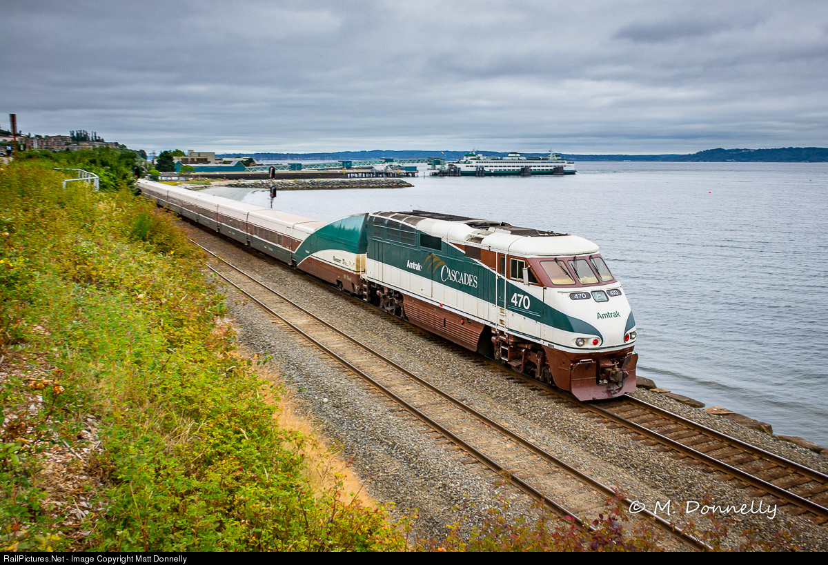 The 470 brings up the markers on this Amtrak Cascades train headed into the station at Edmonds with a ferry in the background. The F59PHI locomotives have been a mainstay since the inception of this service, and the unique "fin" on the Talgo Series 6 end cars was designed purely for aesthetic mating with these tall units which are now being phased out for new SC-44s.