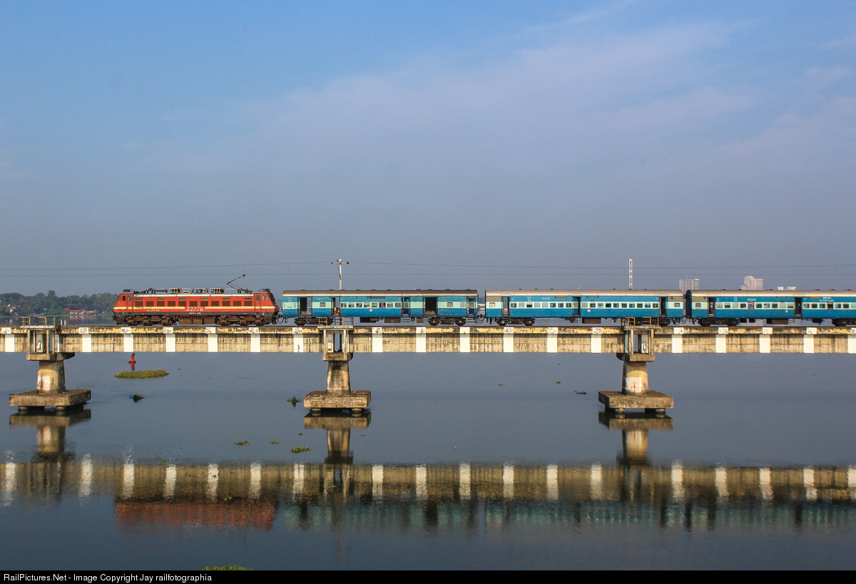 Morning passenger bound for Kayamkulam Jn powered by ERODE WAP-4 crossing Kaithapuzha lake on a sunny morning