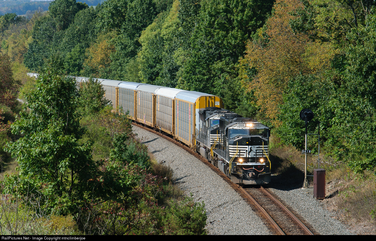 NS 2806, an ex BNSF SD75M now owned by Norfolk Southern, leads auto and intermodal train 28N past the trilight signals at MP 341.