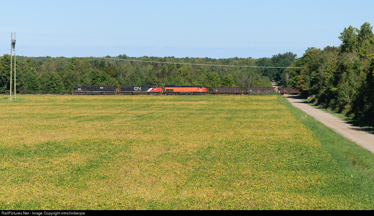 With a rainbow of locomotive schemes all part of the same railroad, an empty Bessemer ore train heads towards the harbor in Conneaut with an IC SD70, CN SD60, and BLE SD40T-3.