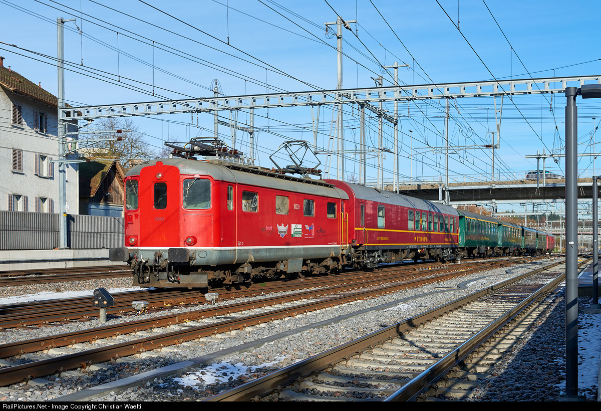 | Former SBB (Swiss Federal Railways) Re 4/4 I No. 10009, now Trans Rail Re 410 009, leads an empty consist of vintage passenger equipment from Wil SG to Basel SBB RB. |
