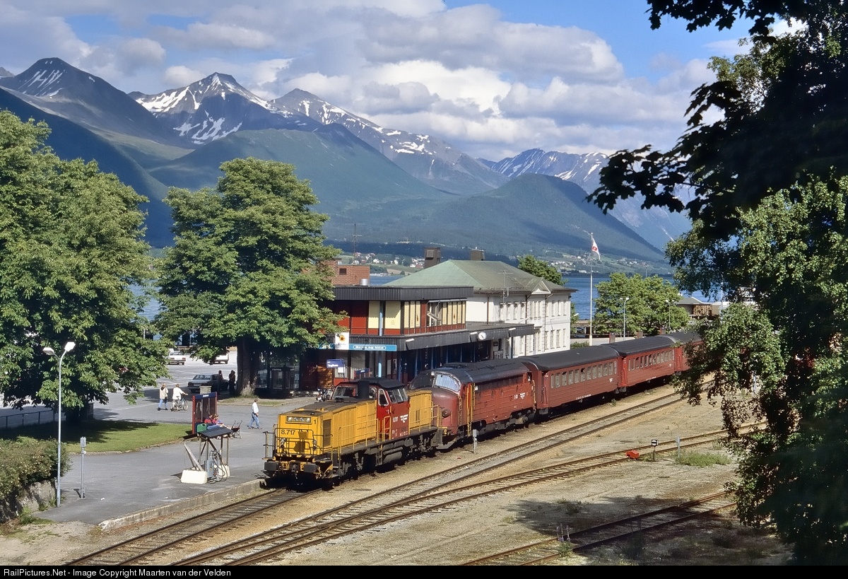 | On sundays the locomotives which had done the services the week before on Raumabane were exchanged between Åndalsnes and the sheds of Marienborg by Trondheim. Di.8 class was used for the freight services, whilst Di.3 class did the passenger services. NSB Di.8.717 and Di.3.621were ready to leave Åndalsnes with train 354 from Åndalsnes to Dombås and Trondheim.
