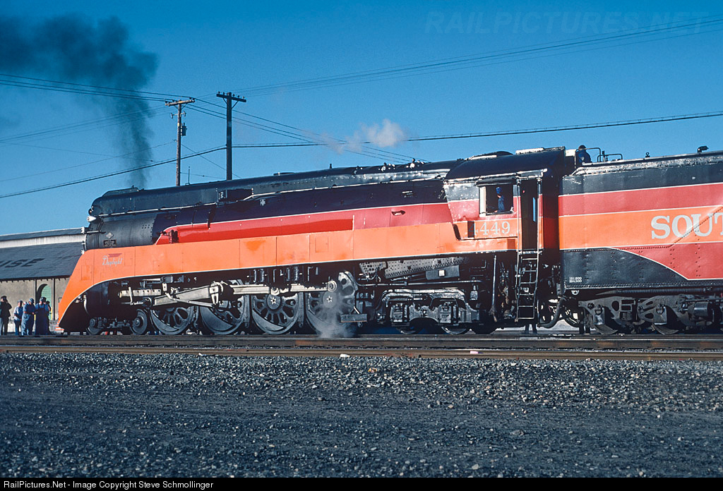 Early in the morning on a beautiful spring day in Fresno, CA, SP 4449 prepares to depart for its today's run over Tehachapi Pass with the Worlds Fair Daylight. The train is headed for New Orleans, LA, and will make a high-speed run to Bakersfield where two SP "Daylight" pained diesels will couple onto the train as lead helpers.