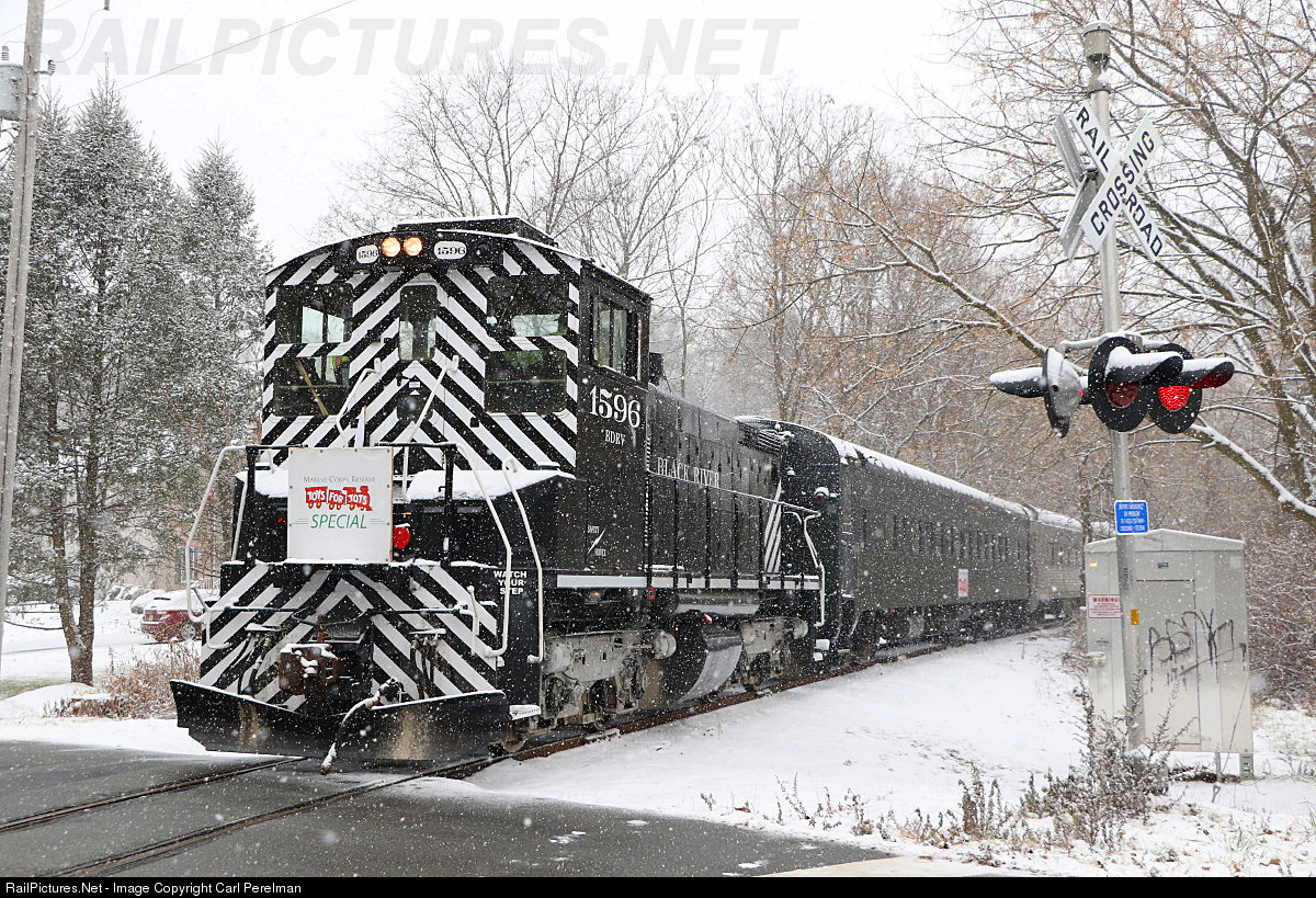 The Toys for Tots train is crossing North Hillside Avenue during the season's first snow storm. BR&W SW1500 1586 is on the rear of the train. |