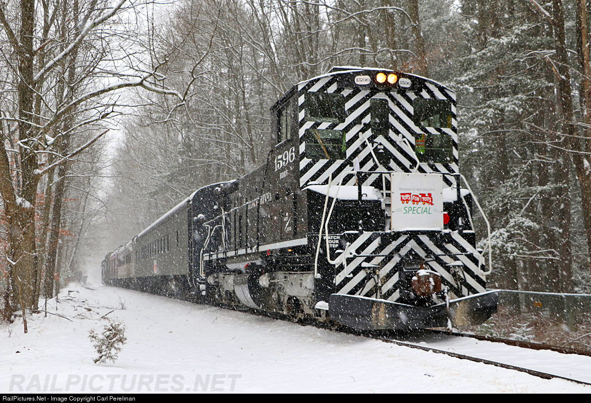 The Toys for Tots train has just crossed Emmons Road during the season's first snow storm. BR&W SW1500 1586 is on the rear of the train. |