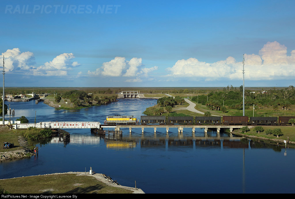 308 crosses the swing bridge at Moore Haven whilst hauling a rake of empty sugarcane cars, 22 Nov 2017