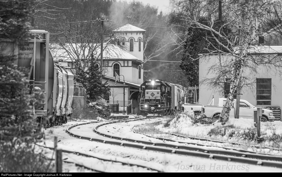 After swapping cars with the NX-11 crew handling yard duties, Housatonic Railroad Company road job NX-12 accelerates away from the Wye and passes the restored Canaan Union Station, as it begins it's trek out of downtown Canaan, Connecticut with a fresh coating of snow on the ground. The Canaan-Pittsfield road train consisted of 27 cars pulled by HRRC EMD GP35s 3601 and 3604 on this day. Union Station once was the meeting point of New York, New Haven & Hartford's Berkshire Line and the Central New England's mainline to Boston Corners, New York.