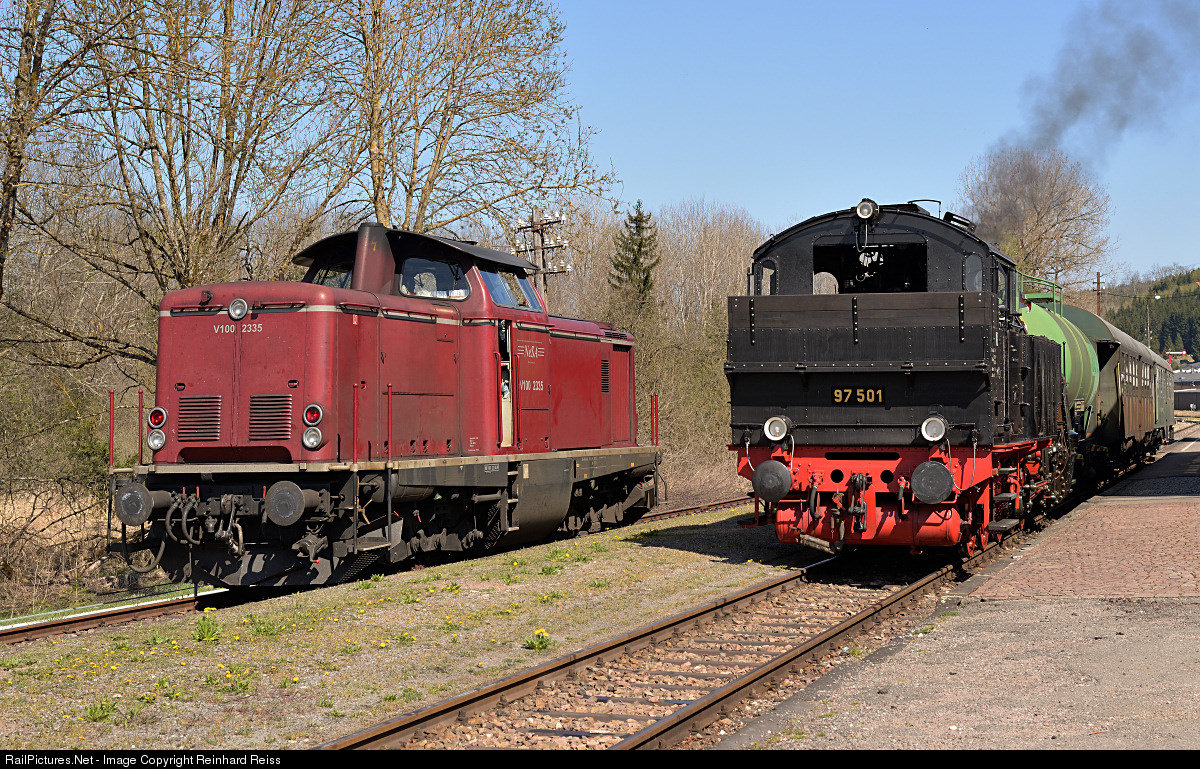 | V 100 2335 from NESA and 97 501 from Zahnradbahn (rack railway) Honau - Lichtenstein (ZHL) have arrived at Blumberg, where 97 501 will take over for some weeks the scheduled trains on the "Sauschwänzlebahn". The own loco of the Sauschwänzlebahn (FK 262) waits in Meiningen works for approval, after an almost complete rebuilt. |