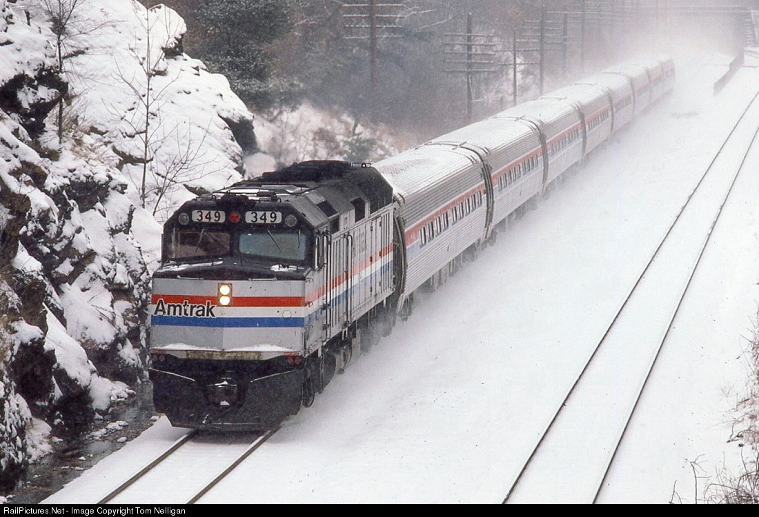 | As snow falls, Amtrak's westbound Bay State rolls through Wellesley, MA, with the usual F40/Amfleet consist. The Bay State was the state-funded "Inland Route" service that ran from Boston to Washington via Springfield and Hartford. This was four-track territory in the heyday of the Boston & Albany. |