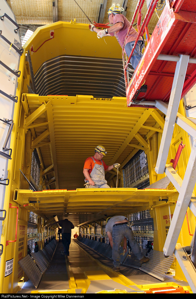 A crew from the paint shop at Union Pacific’s De Soto car shop in Missouri put the finishing touches on the paint and lettering of newly-constructed UP/ETTX autorack No. 715001 on September 29, 2011. All hands on all decks on this tri-level rack!