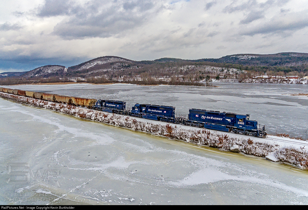 Vermont Rail System's Green Mountain Railroad Bellows Falls switcher uses the Pan Am Railways Bellows Falls to Portland slurry train, BFPO, motive power to switch cars for the Pan Am BF-1 local on Saturday, December 16. For the first time in nearly a year, Pan Am Railways sent a solid set of SD40-2s, MEC 3403, 3401, and 3402, to Bellows Falls for this week's slurry.