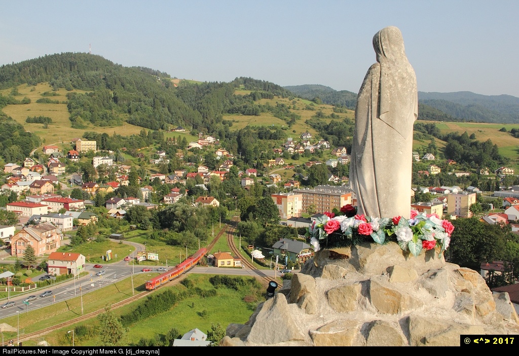 Regional passenger train from Kraków Płaszów to Krynica-Zdrój is just after change its direction and now is passing the Góra Parkowa (Park Mountain) placed in charming town named Muszyna-Zdrój. The figure in right side of image is a sculpture of the Blessed Virgin.