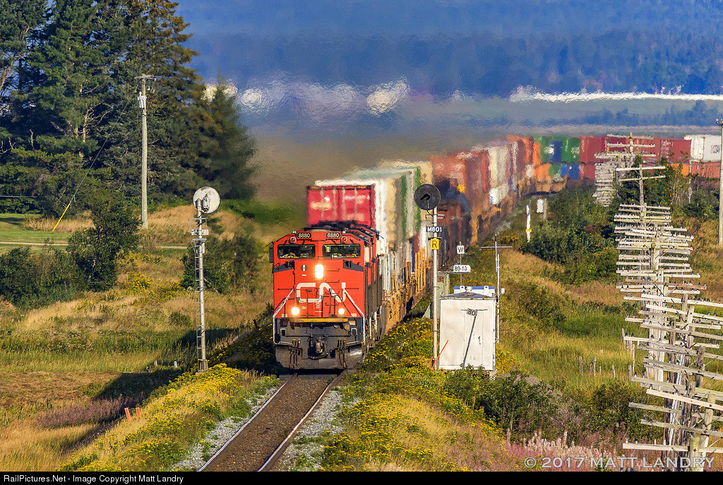| CN 8880 leads stack train Q120, as they split the signals at the New Brunswick/Nova Scotia border, and are on the approach to Amherst, Nova Scotia. |