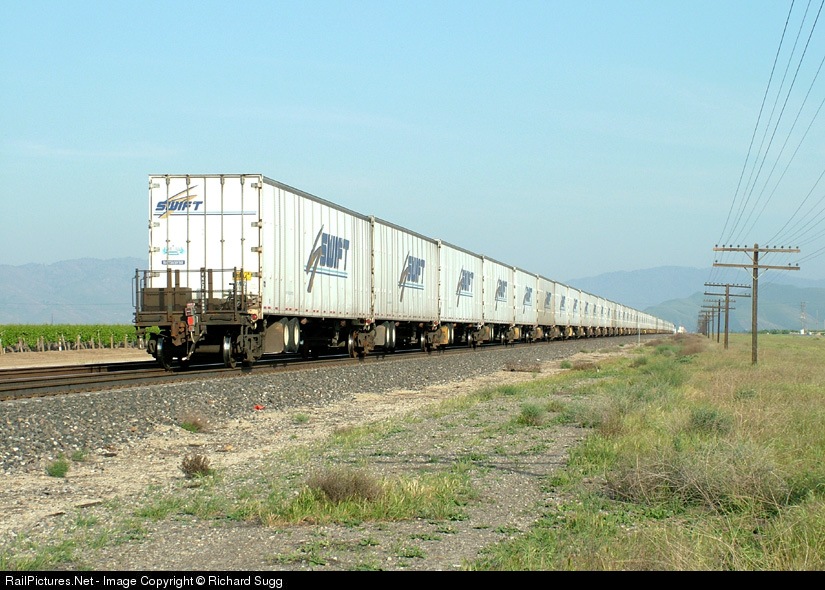 The rear end of the BNSF ZPTLBCA, the southbound Portland-LA Swift Roadrailer train. The train was stopped here for more than 3 hours, waiting for a stalled train to get going further south near Tehachapi.
