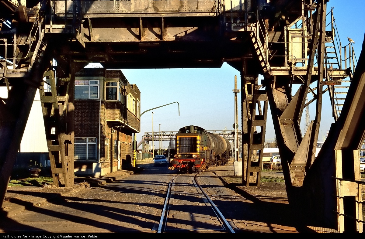 | NMBS/SNCB 8267 "Palma" is entering the "Petroleumbrug" with a freight train to one of the refineries in the port of Antwerpen. The "Petroleumbrug" does not exist anymore. The ports and factories north of the bridge can now only be reached using the "Lillobrug".