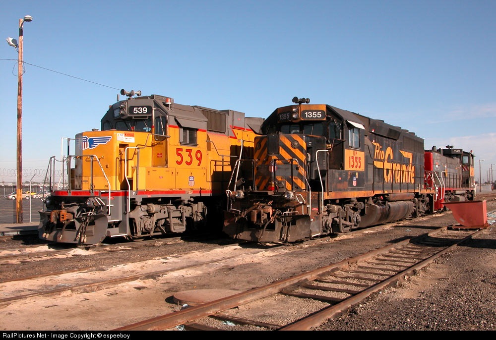 | DRGW colors and SP colors still looking good next to a nice RCL set of baby wings. UP539 is a GP38-2 and UP1471 is the patched ex-SP MP15AC in the background. |