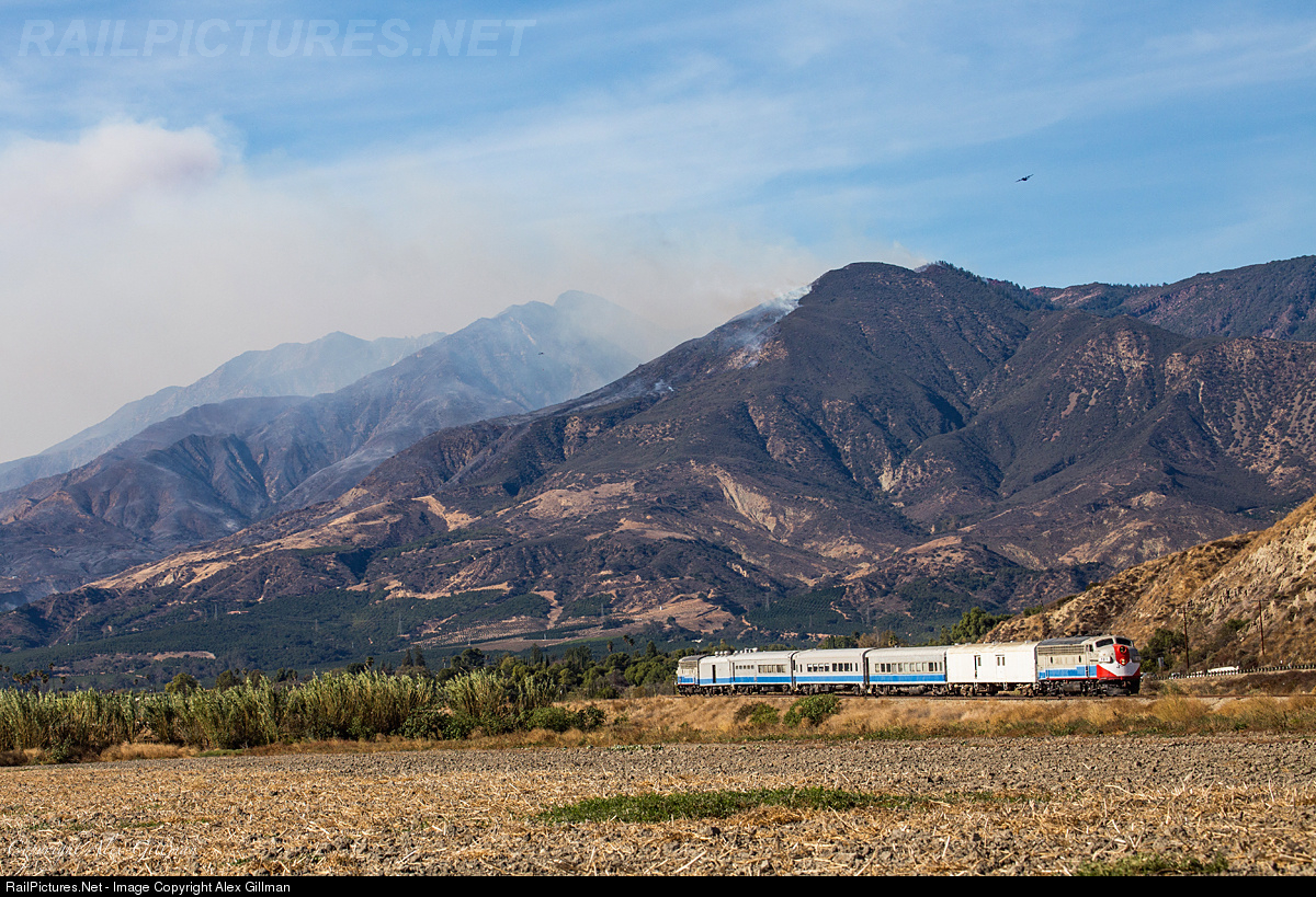 | With the Thomas Fire still raging in the background above the hills of Fillmore, FWRY 101 leads the noon Murder Mystery Lunch Train away from the smoke and flames and toward Piru. High above, a C-130 from the 146th Airlift Wing stationed at Port Hueneme banks to the west following a fire retardant drop on the hillsides out of view. |