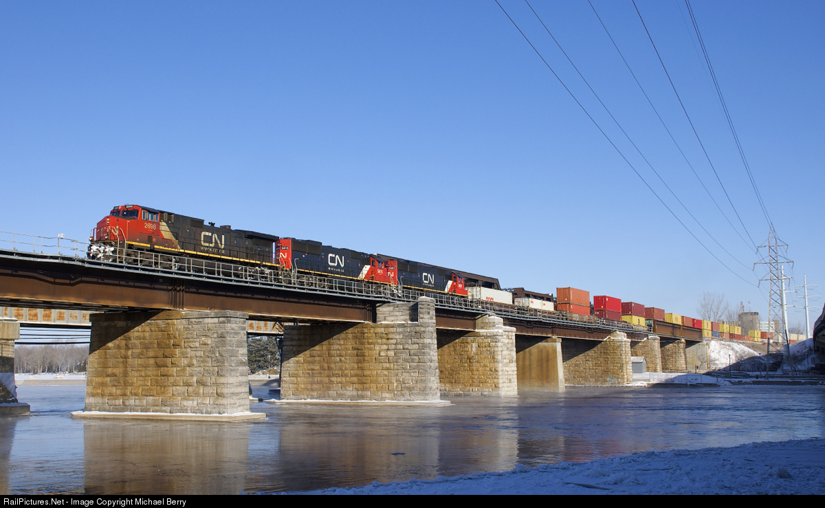 IC 2698 leads a pair of ex-Oakway SD60's (CN 5415 & CN 5451) over the Ottawa River as CN 149 leaves the island of Montreal. It is a very cold morning, as evidenced by steam coming off the river.