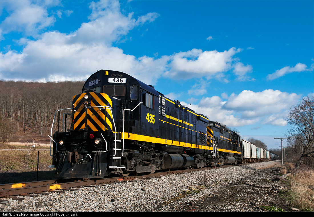 A WNYP job heads west out of Olean toward Meadville, PA behind a pair of C424s. The lead unit wears a fairly fresh coat of black and yellow paint. 435 was built as CP 4228 and worked for QGRY, M&E and the DL previously. The trailing C424, WNYP 421, started life as RDG 5206, later working for CR, D&H and the MEC (Guilford). In the Erie Lackawanna days it would not have been out of place to see a train powered by two similar units on this line.