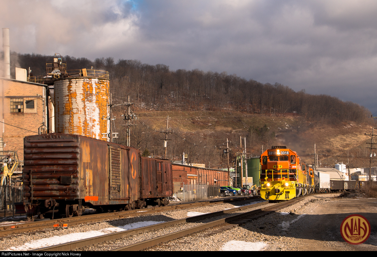 Wasting little time leaving Bradford, southbound Buffalo & Pittsburgh road freight SIRI (Salamanca, NY- Riker/Punxsutawney, PA) accelerates past the ARG Bradford Refinery steam plant. Originally the Kendall Refining Company, this part of the plant is likely of the same vintage as the B&O M26 boxcar behind the Chessie car on the siding.
