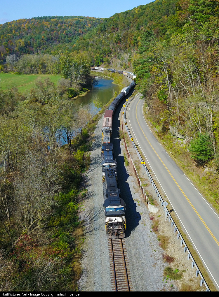 An aerial view of NS mixed freight 36T as it winds its way through the Canisteo River Valley on the Southern Tier.