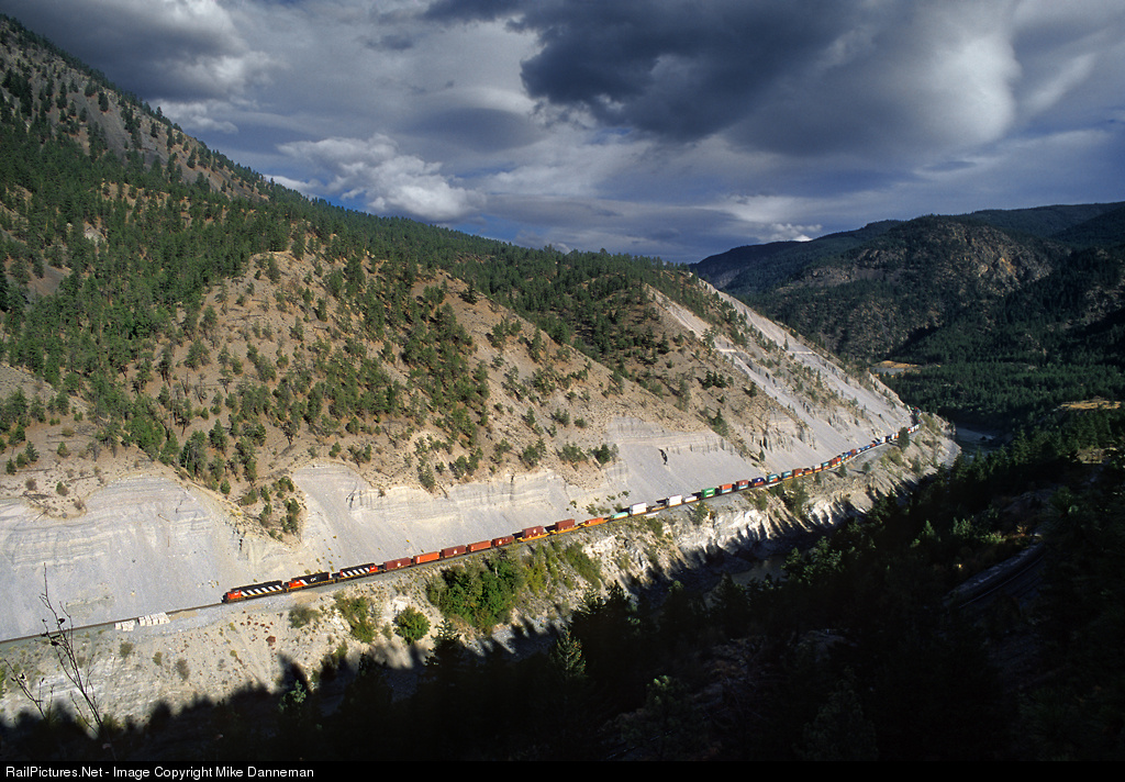 A westbound Canadian National intermodal train edges the Thompson River east of Lytton, British Columbia, on September 28, 2001. Powering the train is EMD SD50F No. 5436 leading two SD40-2Ws, viewed from a scenic overlook in Skihist Provincial Park.