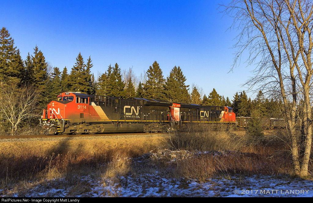 | CN 3114 leads a westbound mixed freight, as they head by Passekeag, New Brunswick, on a cold Winter afternoon. |