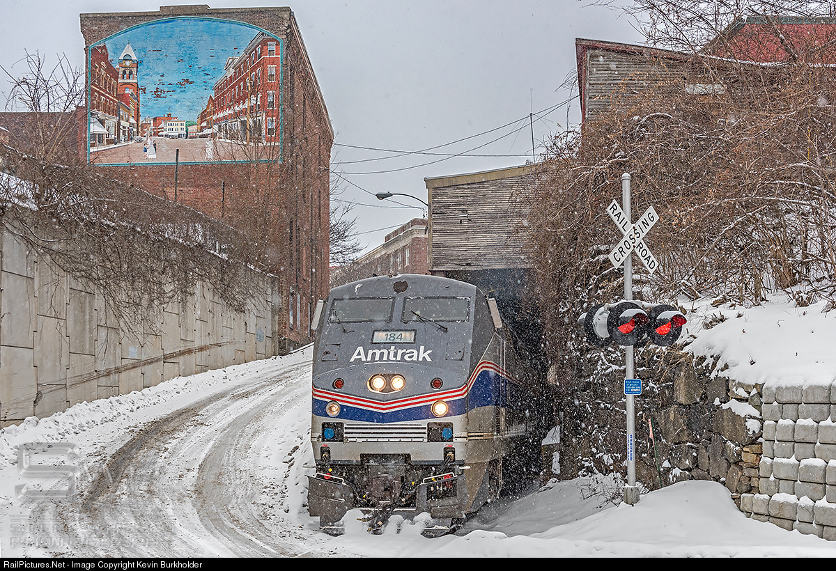 | Amtrak’s Vermonter exits the Bellows Falls tunnel as heavy snow falls with another foot forecast by Saturday. The Vermonter has the Amtrak commemorative P42-9 #184 leading the southbound train. |