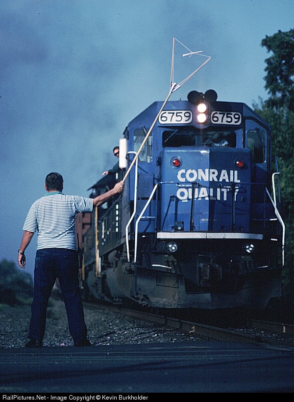 Conrail TBS Operator Jim Largent hoists the trainorder hoop as an approaching engineer leans and aims for the pickup of a NORAC Form D.