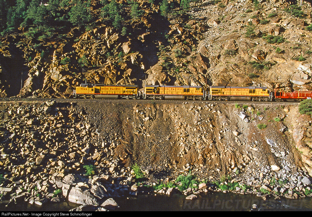 | Just after sunrise, a UP eastbound thunders through Serpentine Canyon. The rock here is quite unstable, and slides are common. WP and now UP maintain slide fences to alert trains to rocks and slides on the right of way. Notice the trail of rock in front of the lead locomotive that reaches the river; it appears to be a slide that has since been cleared from the railroad. |