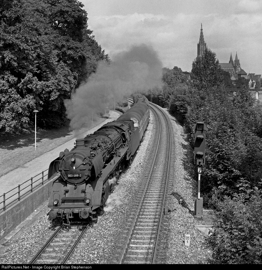 | One of the last two BR 03 light Pacifics to remain in service with the DB heads out of Ulm with the 12.18 train to Friedrichshafen. Ulm cathedral with the highest church spire in the world can be seen in the top right together with a glimpse of the bridge carrying the Munich line over the River Danube. |