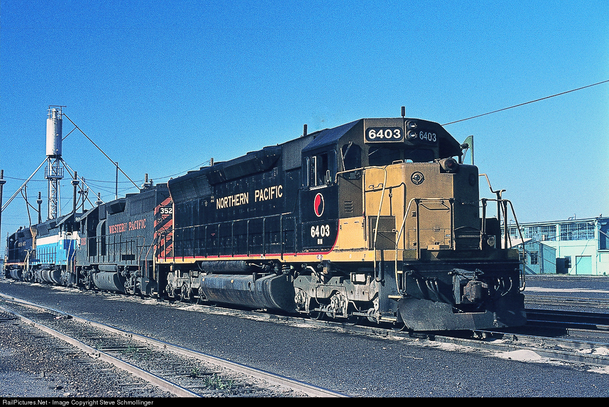 | Power off a BN 137 train idles at the engine facility in WP's Stockton Yard. The power will return to the Pacific Northwest on the counterpart symbol, BN 138, via WP's and BN's Inside Gateway. BN and WP established this power pool to compete directly with SP between California and the Pacific NW. |