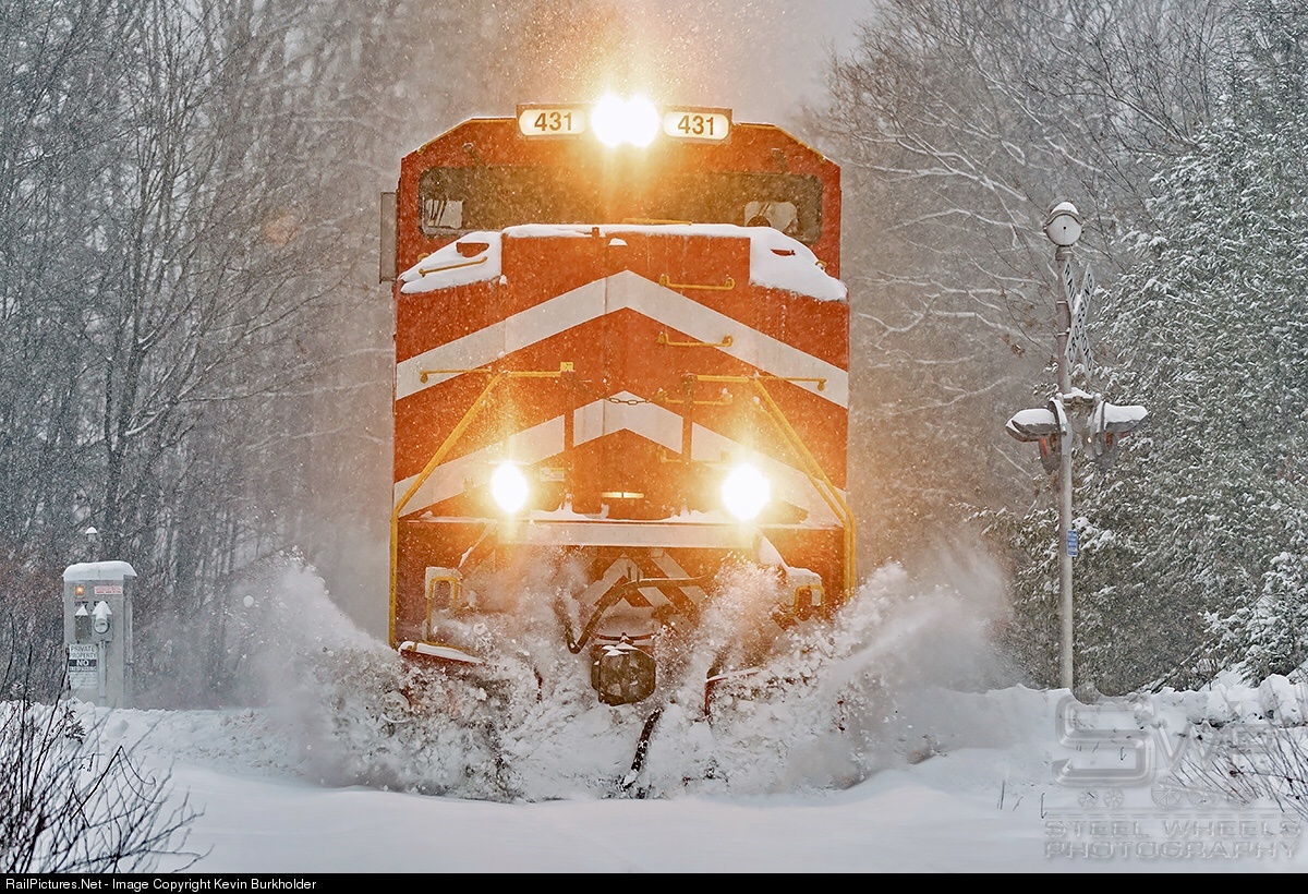 | Vermont Railway SD70M-2 431 leads the GMRC 264-22 train out of the Connecticut River Valley westbound at Brockway Mills, VT, as heavy new snow falls adding to the more than a foot during the past week. |