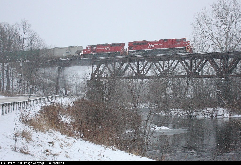 Vermont Railway's B&R Job crosses State Route 67 and the Walloomsac River at Walloomsac, NY as it heads west from North Bennington, VT for Hoosick Junction, NY to interchange with Pan Am Southern. Catching matching red engines pulling trains on Vermont Rail System has become more difficult in recent years due to an increased number of leased engines, so this was certainly an early Christmas present for the photographer!