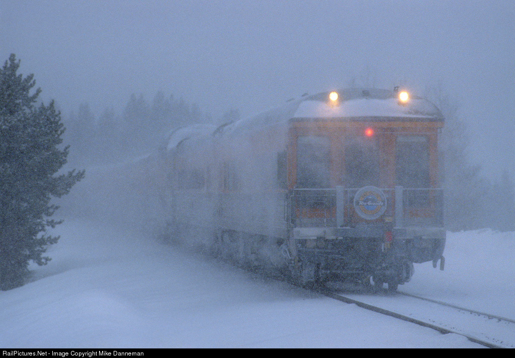 In a high country snowstorm, the Rio Grande Ski Train departs Winter Park, Colorado, after unloading a large group of happy skiers on January 13, 2001. Former Rio Grande business car “Wilson McCarthy,” now Ansco No. 100, the “Kansas,” carries the markers down Winter Park hill towards Tabernash, where the train will be wyed for the return trip.