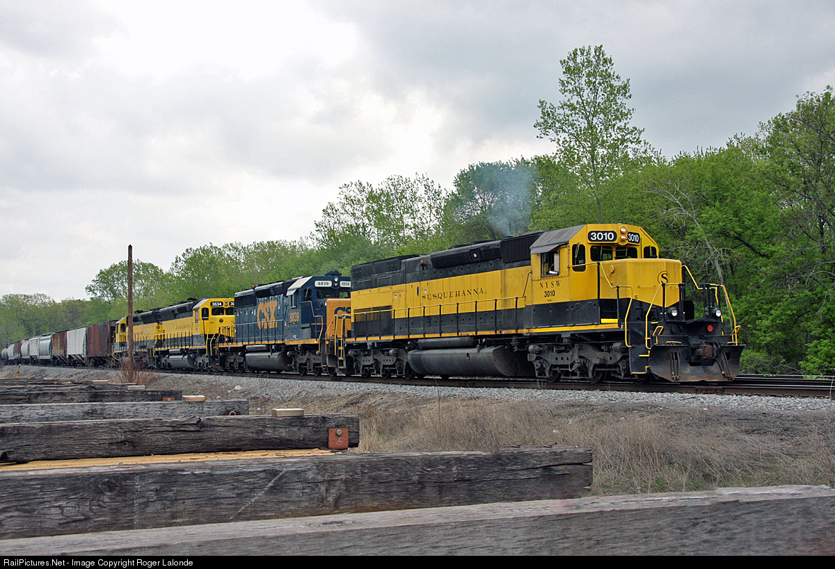 | NYS&W all EMD SD40T-2 3010, CSX SD40-2 8839, and SD45s 3634, 3618. |