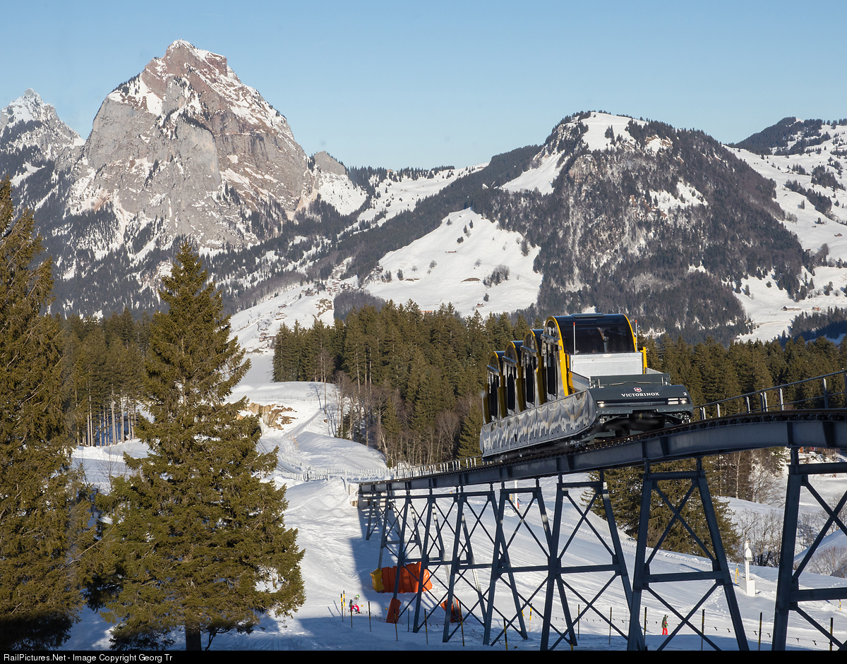 On December 17th, the new funicular from Schlattli to the Stoos sun terrace began operation, the steepest in the world with public service and 2 cars. While the route lies horizontally in the valley and mountain station, the cable car climbs through a total of 3 tunnels with up to 110 % (48 degrees) up the slope and climbs 744 metres in about 4 minutes, the line is 1547 metres long and the highest speed is 10 metres/second (38 km/h). The 4 cabins for up to 136 passengers rotate so that the passengers always stand on level ground. View from the mountain station with approaching car, in the background the Mythen mountains. In this part of the line, the grade is moderate only.