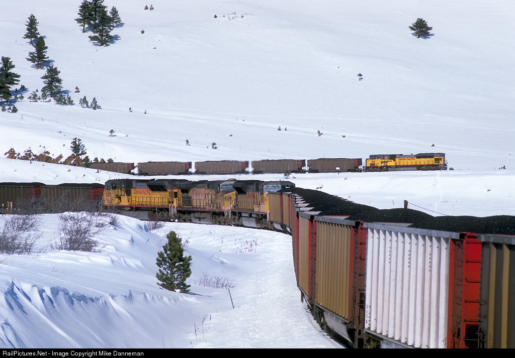 Two DPU sets trail a loaded Union Pacific coal train down the 2-percent grade out of Tunnel 1 between Plain and Clay, Colorado, on a snowy December 22, 2006. The mid-train DPU made up of two EMD SD9043MACs sandwiching a GE AC4400CW are passing the detector at mile 22.6, while lone EMD SD9043MAC No. 8141 as rear DPU holds down the back of the train on then other side of Coal Creek Canyon.