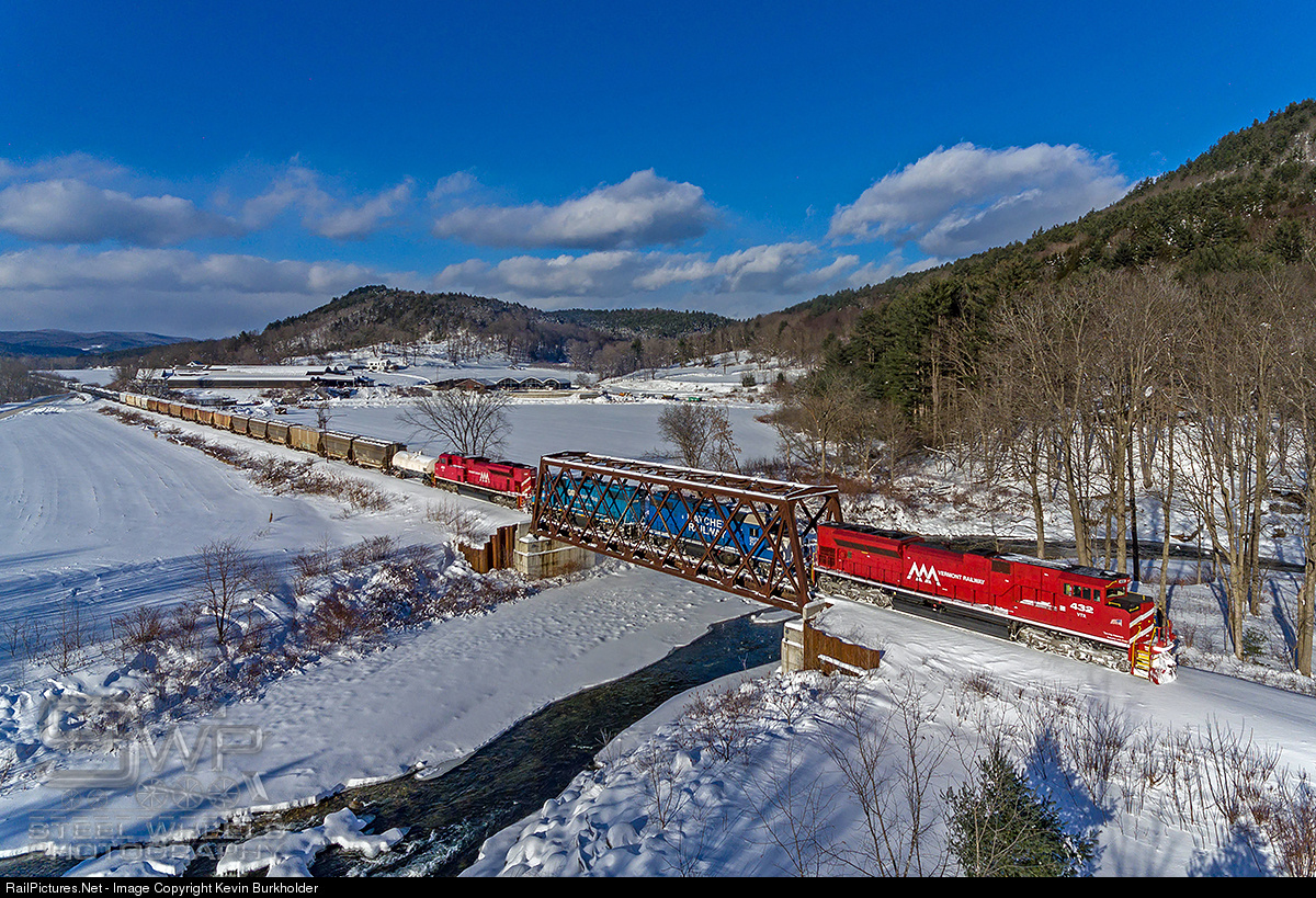 | The Green Mountain RR train 263-26 is “breaking trail” as it makes the first pass after the latest snowfall from Christmas Day. Vermont Railway’s SD70M-2 432 and 431 bracket GMTX GP38-2s 2147 and 2208 with 48 cars for Bellows Falls as the freight is east of Chester, VT. |