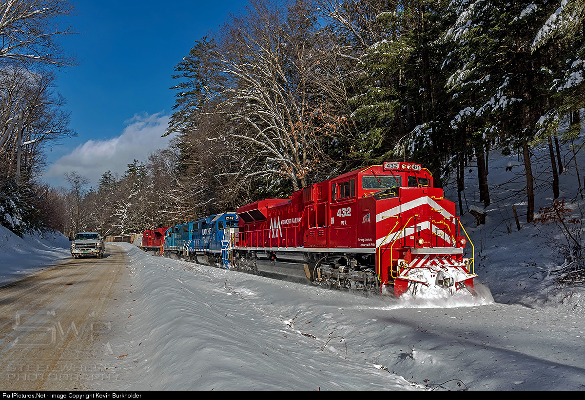 | The Green Mountain RR train 263-26 rolls past a hi-rail truck that has been jumping ahead to clear crossings of ice and compressed snow while rolling out of the Cavendish Gulf at Gassetts, Vermont, with Vermont Railway’s SD70M-2 432 and 431 bracketing GMTX GP38-2s 2147 and 2208 with 48 cars for Bellows Falls. |