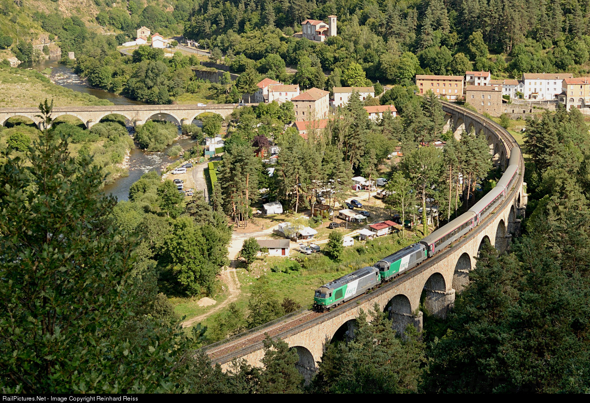 BB 67579 & 67503 from SNCF Fret head Intercité 15952 "Le Cévenol" from Nîmes to Clermont-Ferrand, just passing the Chapeauroux viaduct.