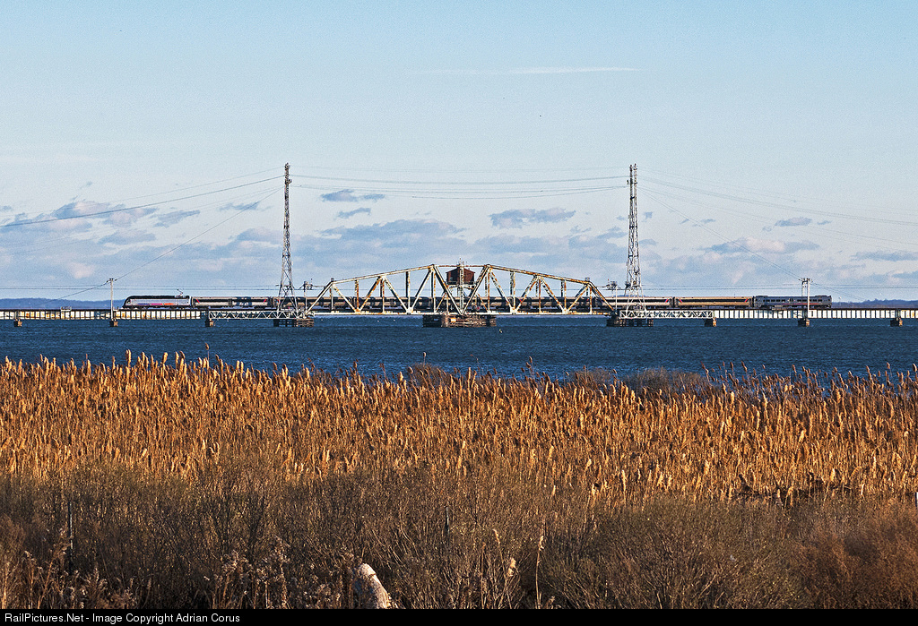 An eastbound Long Branch to New York local crosses the Raritan River by way of the 109-year old PRR built Raritan River Drawbridge.
