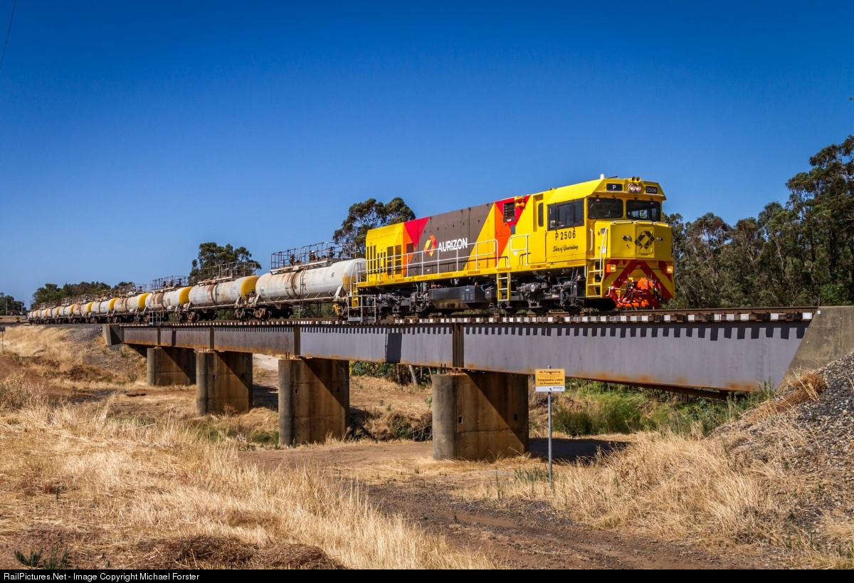 | P2506, fresh out of rebuild, leads an empty caustic soda train over the Collie River bound for Outer Harbour Bunbury. |