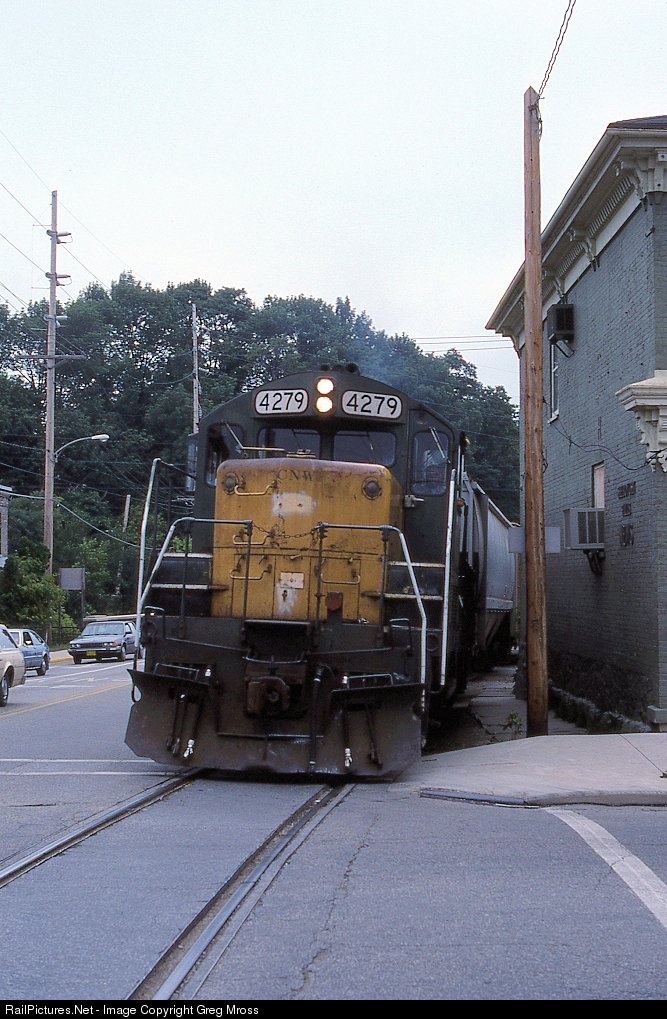 After waiting for traffic to clear, CNW 4279 slowly approaches Broadway St. in Sheboygan Falls in July of 1986. A short segment of street running lies ahead. This line to Plymouth was eventually removed, only to be re-installed a few years ago. As far as I know, WSOR, the new operator, has yet to make a revenue move on this segment of the line.