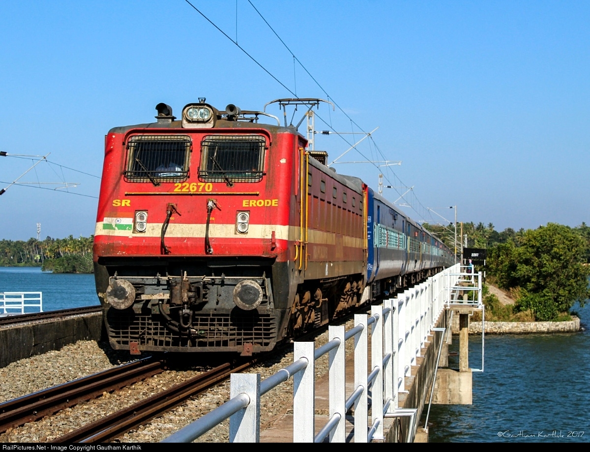 | Vanchinad express ferrying office going people to capital city of Kerala,crosses Paravur Lake with an Erode WAP-4 in lead. |