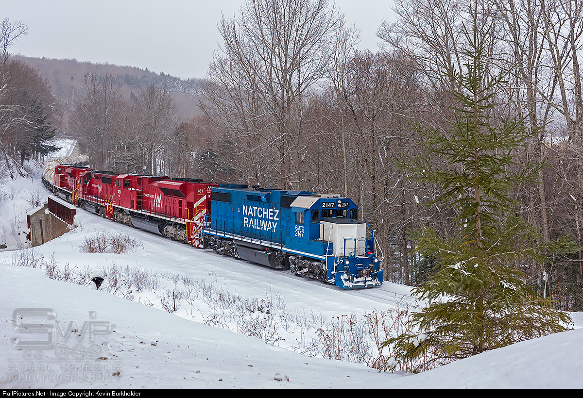 | Skiers are just out of view as they downhill over the Saturday slurry train on the Vermont Rail System's Green Mountain Railroad on December 30, 2017. GMRC 263-30 is led by GMTX GP38-2 2147 "Natchez Railway", as well as Vermont Railway SD70M-2 431, GP40-2 307 and SD70M-2 432. |
