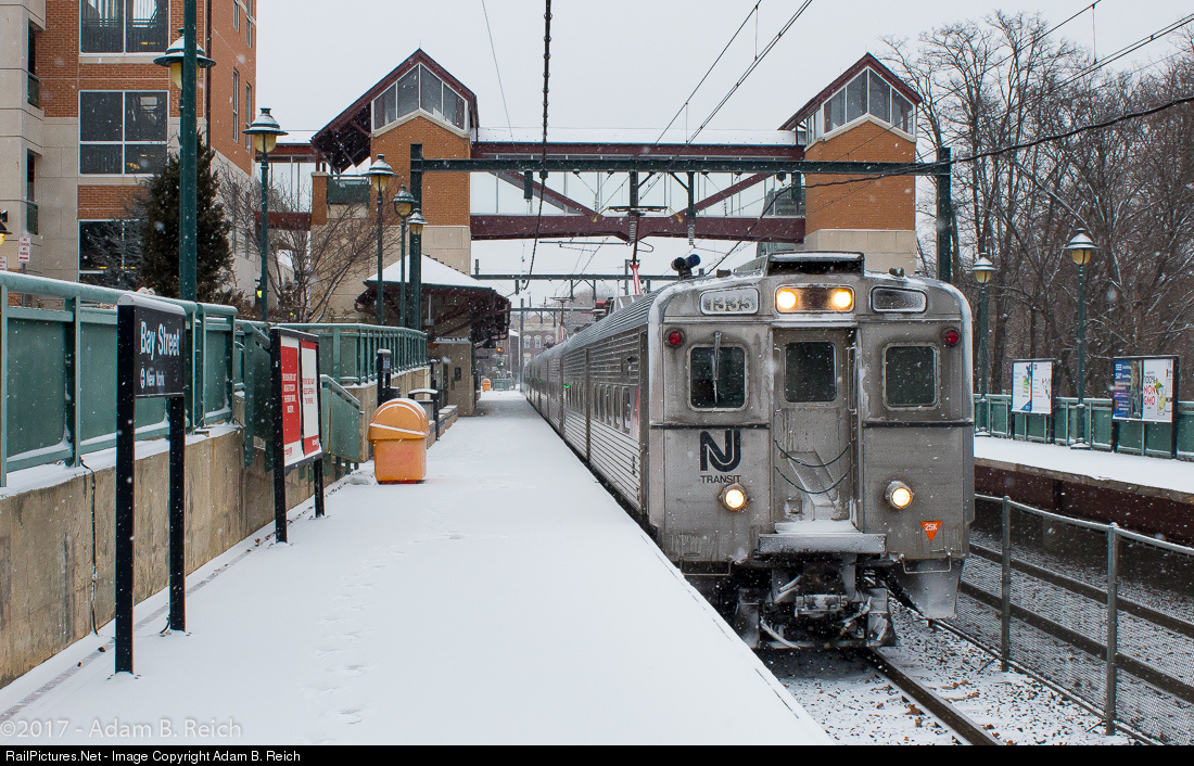 : Montclair-Boonton Line Train #522 departs Montclair's Bay Street Station on a snowy Saturday afternoon with Arrow III #1335 leading.