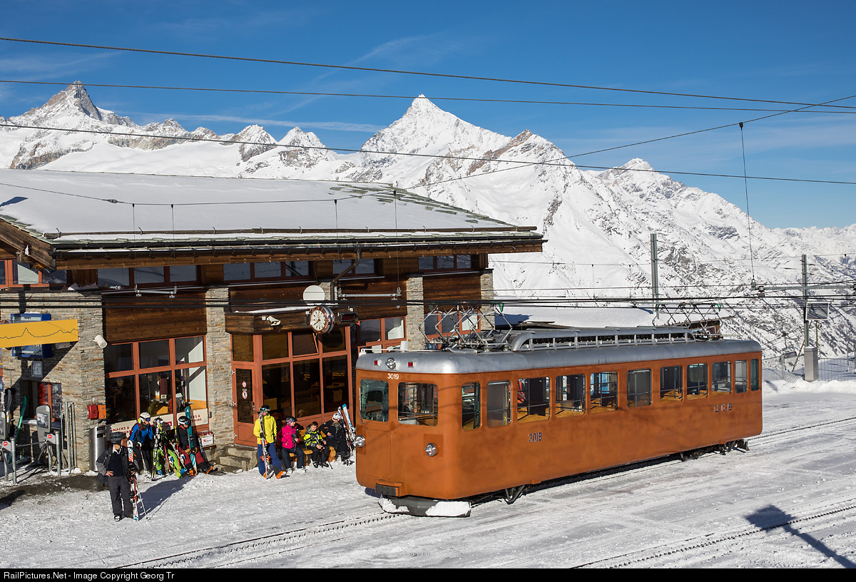 On days of high demand, the vintage cogwheel railcars of the Bhe 2/4 series of the GGB are still needed. # 3019 was built in 1961 by SLM and BBC, has 190 kW and 56 seats. From the series # 3011 to 3022, built from 1949, are 4 railcars still operational, others are scrapped or rebuilt for service duties. # 3019 is ready at Riffelberg station (2582 meter a.s.l.) to bring more skiers and sledgers up to the Gornergrat. In the background left the 4221 meter high Zinalrothorn and the Weisshorn (4506 meter) on the right.