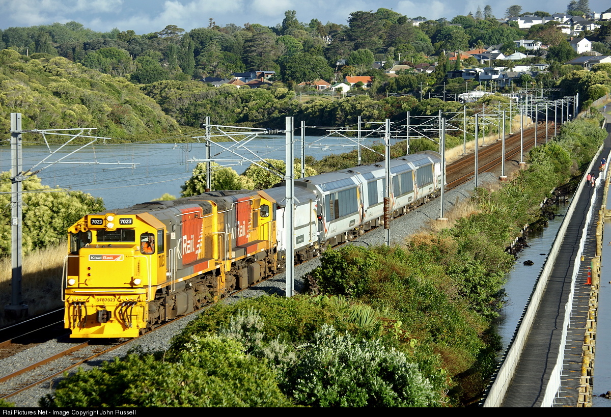 | The DF class were built by GM in Canada and introduced from 1979. In 1990's were upgraded with turbo etc to GT22 MC. The Northern Explorer runs 680 Km (420 miles) between the capital Wellington and Auckland. The train was built by Hillside works in Dunedin and entered service in 2012. 7199 is the second locomotive which is used to haul the train in the opposite direction on arrival due to track maintenance closure beyond the Strand terminus. |